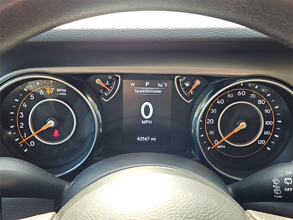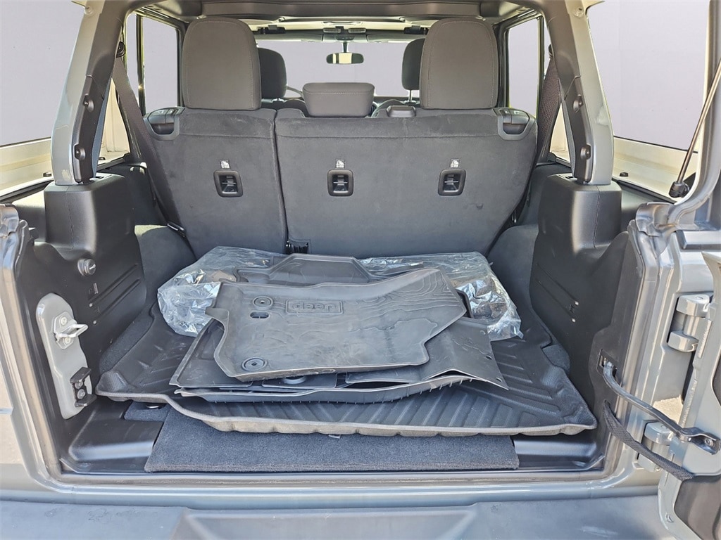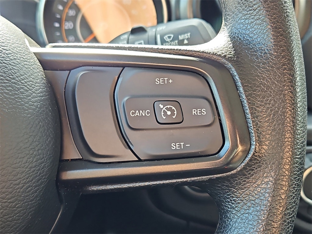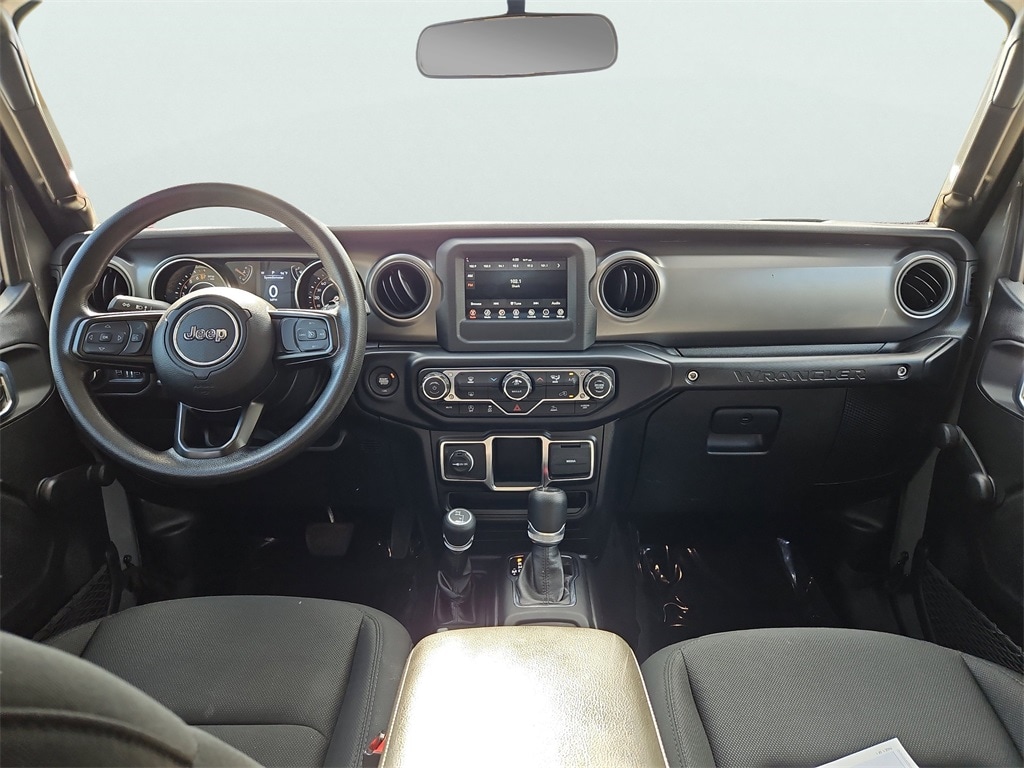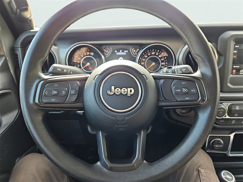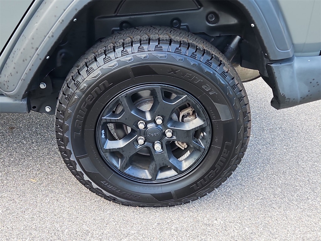 Quick Order Package 25K Willys Sport (4-Wheel Drive Swing Gate Decal, 97 MPH Vehicle Max Speed Calibration, Anti-Spin Differential Rear Axle, BF Goodrich Brand Tires, Black Grille, Black Trail Rated Badge, Deep Tint Sunscreen Windows, Matte Black Jeep Badge, Mold In Color Bumper w/Gloss Black, MOPAR All-Weather Floor Mats, Wheels: 17" x 7.5" Moab Black Aluminum, Willys, and Willys Hood Decal), 110 MPH Vehicle Max Speed Calibration, 3.45 Rear Axle Ratio, 4-Wheel Disc Brakes, 8 Speakers, ABS brakes, Air Conditioning, AM/FM radio, Apple CarPlay/Android Auto, Aux Battery, Black 3-Piece Hard Top, Brake assist, Cloth Low-Back Bucket Seats, Compass, Delay-off headlights, Driver door bin, Driver vanity mirror, Dual front impact airbags, Dual front side impact airbags, Electronic Stability Control, Emergency communication system: SiriusXM Guardian, Engine Oil Cooler, Freedom Panel Storage Bag, Front anti-roll bar, Front Bucket Seats, Front Center Armrest w/Storage, Front fog lights, Front reading lights, Integrated roll-over protection, Low tire pressure warning, No Soft Top, Non-Lock Fuel Cap w/o Discriminator, Normal Duty Suspension, Occupant sensing airbag, Outside temperature display, ParkView Rear Back-Up Camera, Passenger door bin, Passenger vanity mirror, Power steering, Radio data system, Radio: Uconnect 4 w/7" Display, Rear anti-roll bar, Rear reading lights, Rear Window Defroster, Rear Window Wiper/Washer, Speed control, Split folding rear seat, Steering wheel mounted audio controls, Stop-Start Dual Battery System, Tachometer, Telescoping steering wheel, Tilt steering wheel, Traction control, Trip computer, Variably intermittent wipers, and Wheels: 17" x 7.5" Black Steel Styled.
